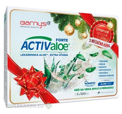 Výživový doplnok rastlinný Barny´s ACTIValoe® Forte obsahuje patentom chránený vysokoakostný 100 % aloe gél z ekologicky pestovaných listov Aloe barbadensis Mill.