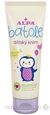 Detský krém s obsahom olivového oleja je vhodný na ošetrenie celého tela i tváre. Dobre sa roztiera a vytvára na pokožke jemný ochranný film. Ďalšou zložkou je extrakt z listu olivovníka, ktorý spôsobuje jemný zelený nádych krému.