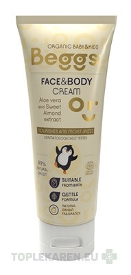 Beggs Detský hydratačný krém na tvár a telíčko je vhodný pre Vaše dieťatko už od narodenia. Prírodné zloženie s bambuckým maslom je pre bábätká najvhodnejšia starostlivosť. Maslo je bohaté na vitamín E, ktorý má antioxidačné vlastnosti, navyše pokožku vyživuje a spoločne s extraktom zo sladkých mandlí z Provence ju aj zjemňuje. Krém obsahuje aj aloe vera šťavu, ktorá podporuje hydratáciu pokožky, vyživuje ju a chráni. Všetky tieto zložky pochádzajú z kontrolovaného ekologického poľnohospodárstva (BIO) a 99 % zložiek v balení je prírodného pôvodu.