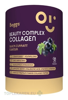 Beggs Beauty Complex Collagen je prémiový kolagénový doplnok stravy s jedinečným zložením navrhnutý pre tých, ktorí chcú krásnu pleť a lesklé vlasy vďaka podpore zvnútra. Každá denná dávka obsahuje 5 000 mg hydrolyzovaného rybieho kolagénu Naticol®, ktorý sa vyznačuje vysokou čistotou a výbornou vstrebateľnosťou. Je obohatený o fytoceramidy Ceramosides™, kyselinu hyalurónovú, biotín a zinok – harmonickú kombináciu spájanú so starostlivosťou o pleť, jej sviežim, hydratovaným a žiarivým vzhľadom. Vitamín C navyše prispieva k normálnej tvorbe kolagénu pre správnu funkciu pokožky, ktorá si tak uchováva svoju prirodzenú pevnosť a pružnosť.