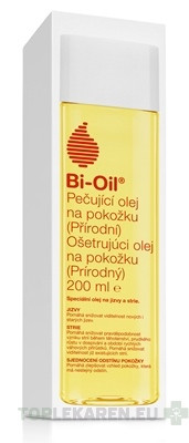 Bi-Oil ® Ošetrujúci olej (Prírodný) je 100% prírodný špeciálny olej, ktorý ošetruje pokožku a zlepšuje vzhľad jaziev, strií a nejednotného odtieňa pokožky. Je tiež účinný na starnúcu a dehydrovanú pokožku. Obsahuje vitamíny A a E a prírodné rastlinné oleje z nechtíka, levandule, rozmarínu a harmančeka. Je vhodný na citlivú pokožku, nekomedogénny. Bi-Oil pomáha znižovať viditeľnosť nových i starých jaziev. Znižuje pravdepodobnosť vzniku strií počas tehotenstva, prudkého rastu počas dospievania a v období rýchlych prírastkov na váhe. Vhodný aj na už existujúce strie. Olej zlepšuje vzhľad pigmentových škvŕn a znamienok spôsobených hormonálnymi výkyvmi, zosvetlením pleti alebo nadmerným vystavovaním slnku. Napomáha pokožku vyhladiť, zjednotiť tón starnúcej a vráskavej pokožky tváre i tela a udržať pokožku hydratovanú. Vďaka jedinečnému zloženiu sa ľahko rozotiera a rýchlo sa vstrebáva.