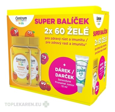 Glukózový sirup; cukor; želatína; vitamín C (kyselina L-askorbová) - 40 mg (50 %*); regulátor kyslosti (kyselina citrónová); niacín (NE) (nikotínamid) - 8 mg (50 %*); maltodextrín; vitamín E (α-TE) (DL-alfa-tokoferylacetát) - 5 mg (42 %*); zinok (síran zinočnatý) - 2,8 mg (28 %*); potravinové farbivo (koncentrát z mrkvy a čiernych ríbezlí, reďkovky, svetlice farbiarskej, čiernej mrkvy, čerešne); prírodné arómy (pomarančová, čerešňová, jahodová, malinová); rastlinné oleje (kokosový, repkový); vitamín B6 (pyridoxínhydrochlorid) - 0,8 mg (57 %*); vitamín A (RE) (retinylacetát) - 330 µg (41 %*); leštiace látky: karnaubský vosk, včelí vosk; jód (jodid draselný) - 50 µg (33 %*); biotín (D-biotín) - 12 µg (24 %*); vitamín D (cholekalciferol) - 5 µg (100 %*); vitamín B12 (kyanokobalamín) - 1 µg (40 %*).