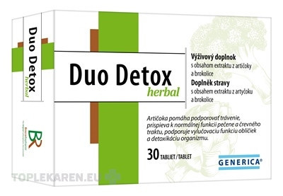 Prípravok Duo Detox herbal obsahuje kombináciu 2 prírodných látok, extraktu z artičoky a patentovaného extraktu z brokolice BroccoRaphanin® na podporu detoxikácie organizmu. Artičoka obsahuje prirodzene sa vyskytujúce antioxidanty. Pomáha podporovať trávenie, prispieva k normálnej funkcii pečene a črevného traktu, podporuje vylučovaciu funkciu obličiek a detoxikáciu organizmu.