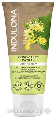 Krém na rucky INDULONA OBNOVUJÚCI ZÁZRAK bol špeciálne vyvinutý na účinnú hydratáciu pokožky, jej ochranu pred vysušením a posilnenie proti vonkajším vplyvom. Uzamyká v pokožke vlhkosť a poskytuje jej dlhotrvajúcu ochranu. Obsahuje organickú vodu z lipových kvetov, známu svojimi vysoko hydratačnými a antioxidačnými vlastnosťami, 15 % glycerínu a 93 % zložiek prírodného pôvodu.