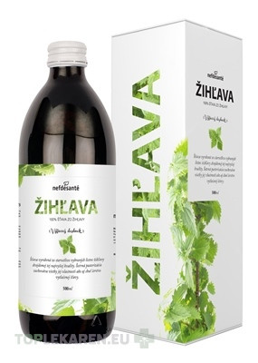 ŽIHĽAVA, výživový doplnok. 100 % pasterizovaná šťava vyrobená zo starostlivo vybraných listov žihľavy dvojdomej (Urtica dioica). Jedná sa o 500 ml fľaše zabalené v krabičke.