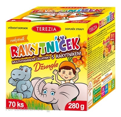 Nové multivitamínové želatínky RAKYTNÍČEK DŽUNGĽA – príchuť rakytník obsahujú účinnú látku rakytník a zmes ovocných koncentrátov a vitamíny. RAKYTNÍK REŠETLIAKOVÝ je vhodný na podporu obranyschopnosti organizmu, pomáha