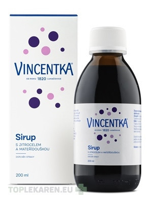 VINCENTKA sirup je prípravok s obsahom rastlinných extraktov zo skorocela a materinej dúšky v kombinácii s minerálnou vodou VINCENTKA.